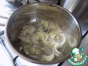 • Пока варится чечевица, грибы и картофель, делаем заправку в щи. Она нам потребуется полностью готовой. В сотейник наливаем масло греем его и выкладываем мелко порубленный чеснок. Через минуту-лук. Золотим.