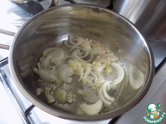 Пока варится чечевица, грибы и картофель, делаем заправку в щи. Она нам потребуется полностью готовой. В сотейник наливаем масло греем его и выкладываем мелко порубленный чеснок. Через минуту-лук. Золотим.
