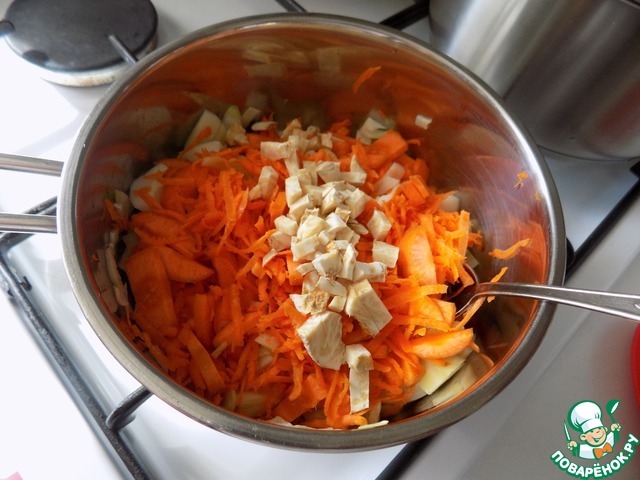 Далее очередь моркови и корневого сельдерея. Половину моркови и сельдерей я порезала, а половину другую моркови натёрла. Продолжаем томить ещё минут 10 до готовности овощей.