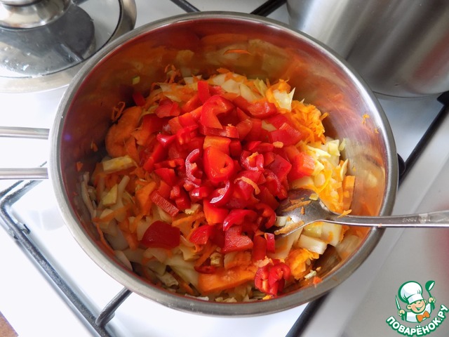 • Теперь выкладываем капусту белокочанную, нашинкованную мелко. Убавляем огонь и томим её вместе с луком почти до готовности. Это минут 15.