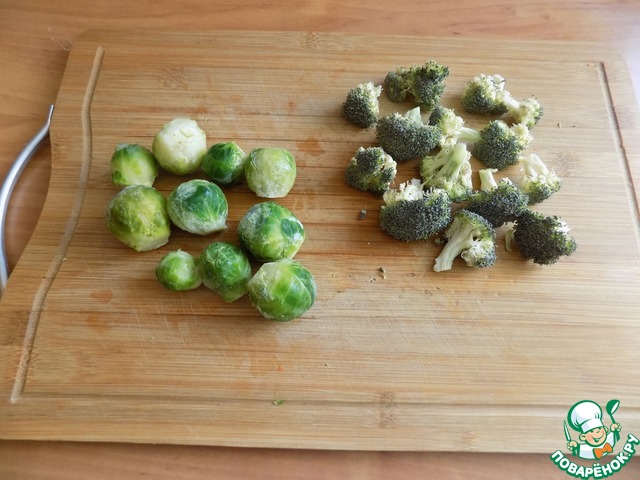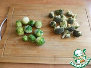 • Брюссельская капуста и брокколи варятся очень быстро. Я взяла замороженную капусту. Разморозила под струёй воды, выложив капусту в дуршлаг.