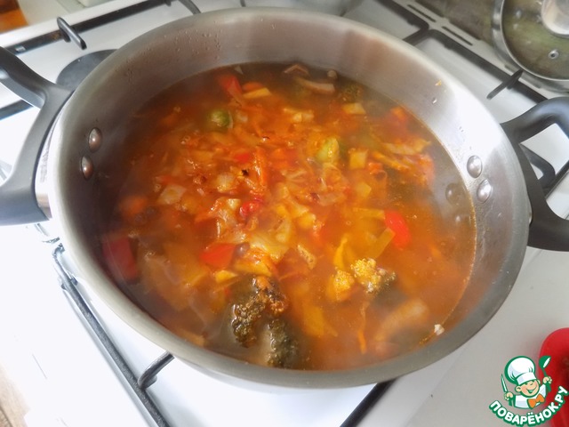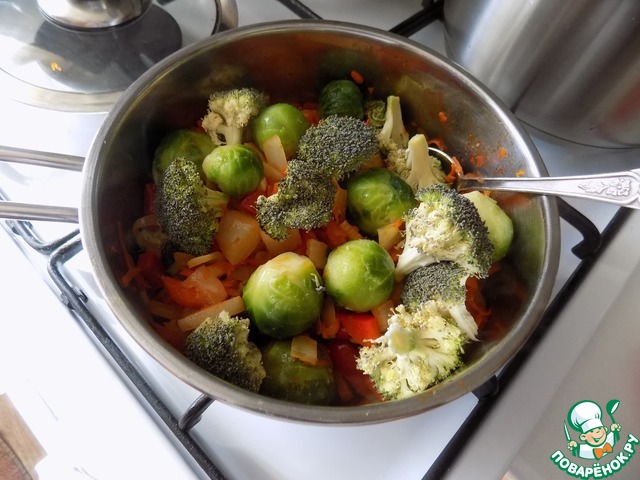 • В полностью готовые овощи выкладываем брокколи и брюссельскую капусту. Перемешиваем, томим ещё минуту.