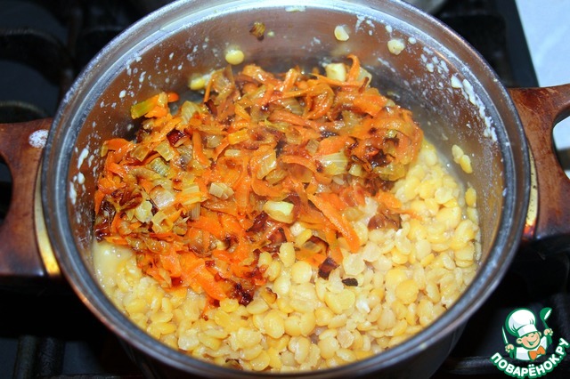 Нарезанные морковь и лук обжарить на растительном масле, добавить в готовый горох Айдахо ТМ "Мистраль".