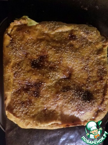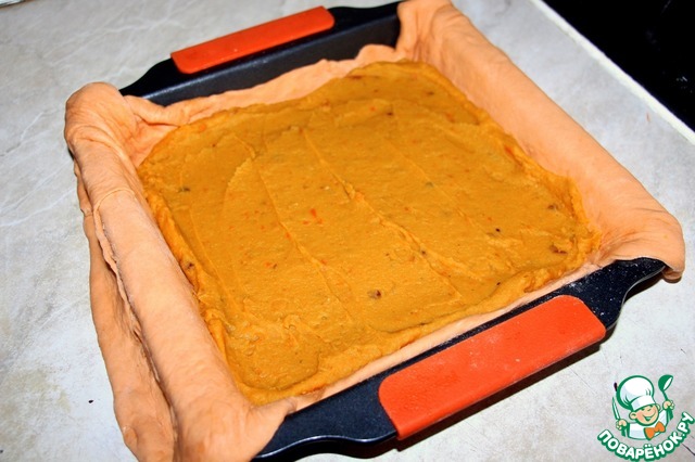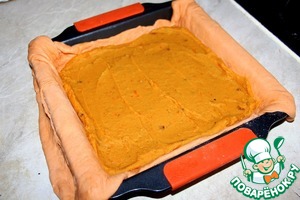 Тесто раскатать, выложить в смазанную маслом форму, оставив длинные свесы для формирования пирога.
