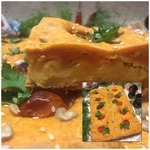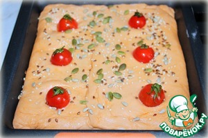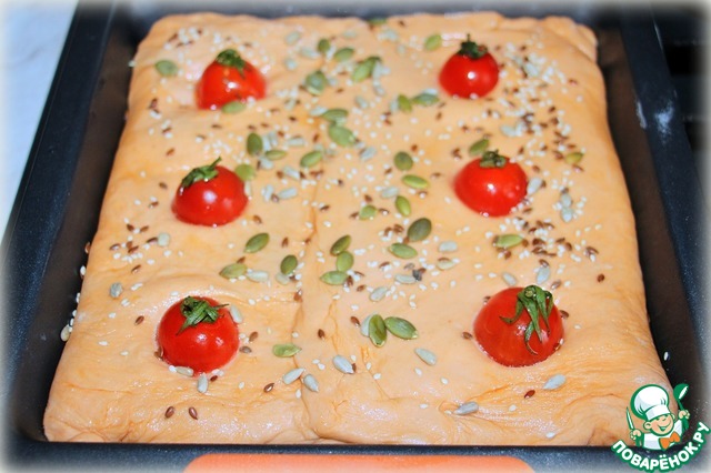 Свесы теста завернуть поверх начинки и защипнуть по середине. Я украсила пирог черри и смесью семечек.