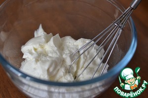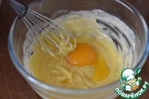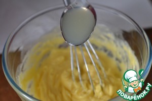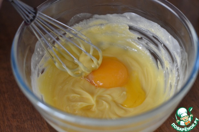 По одному добавляем желки и взбиваем.