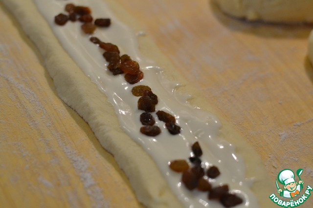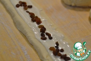 На середину полоски выкладываем творог и посыпаем изюмом