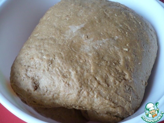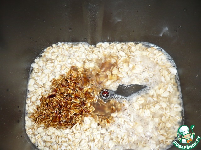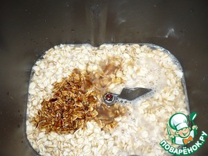 Тесто я, замешивала с помощью хлебопечки. В ведерко хлебопечки высыпать овсяные хлопья, добавить солод и залить кипящей водой. Оставить на 30-40 минут набухать и остывать до теплого состояния.