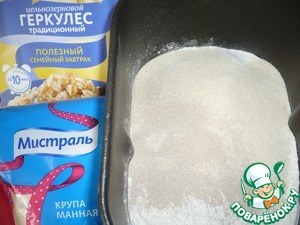 Затем добавить в ведерко (согласно инструкции): сахар, мед, растительное масло, манную крупу ТМ "Мистраль", муку пшеничную, дрожжи, соль. Поместить ведерко в хлебопечку, включить режим замеса теста.