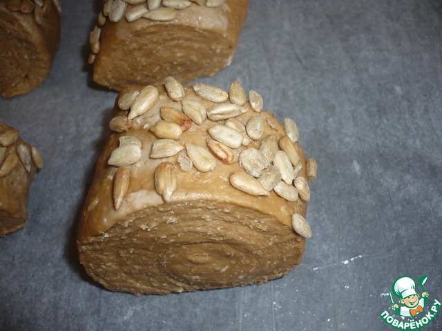 Подготовить тарелку с семечками подсолнуха (по желанию можно добавить овсяные хлопья "Геркулес"). Берем приготовленные треугольники-булочки верх булочек слегка смазываем водой и обмакиваем в семечки. Выложить на противень застеленный пергаментной бумагой. Прикрыть салфеткой или полотенцем и оставить в теплом месте на 20-25 минут.