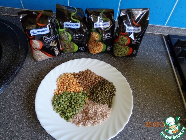 Затем к овощам положим : горох "Орегон" зеленый колотый ТМ "Мистраль", горох "Айдахо" желтый колотый ТМ "Мистраль", фасоль "Маш" зеленая ТМ "Мистраль", рис "Самарканд" ТМ "Мистраль" и зеленую чечевицу.