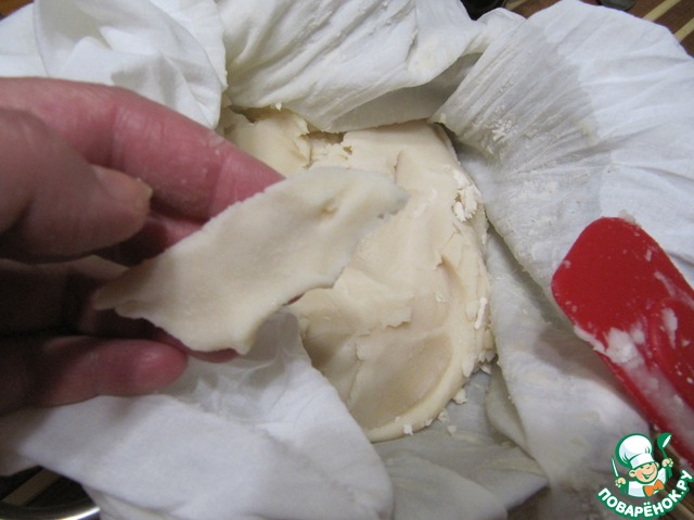 Затем нужно отжать пюре от лишней жидкости. Для этого тонкой тканью (желательно изношенной, но плотной, марлю НЕ использовать!) застелить сито, закрепить края, вылить пюре. Сначала мешать ложкой, затем завязать края ткани и отжать максимально руками. На выходе получается гладкая, податливая смесь (выход - примерно 900 г).