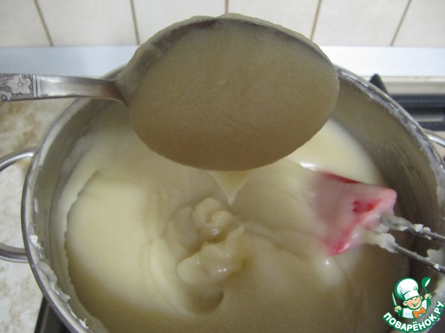 По мере уваривания становится густой. Очень ВАЖНО не переварить смесь, так как при остывании переваренная смесь станет буквально каменной. Нужно довести пасту до состояния густой манной каши, когда смесь при наклоне ложки задерживается на ней, затем падает.