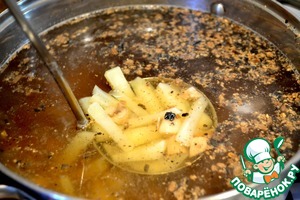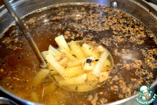 В кипящую воду отправляем картошку порезанную соломкой, маринованные грибы и порошок сушёных из грибов.
