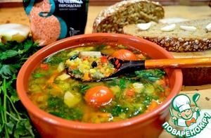 За пять минут до выключения супа добавить помидоры, зелень мелко порезанную, натёртые чеснок и имбирь.
