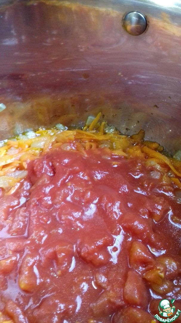 Параллельно начать готовить суп. В толстостенной кастрюле слегка обжарить на растительном масле измельченный лук. Добавить морковь, через 5 минут томаты, довести до кипения.
