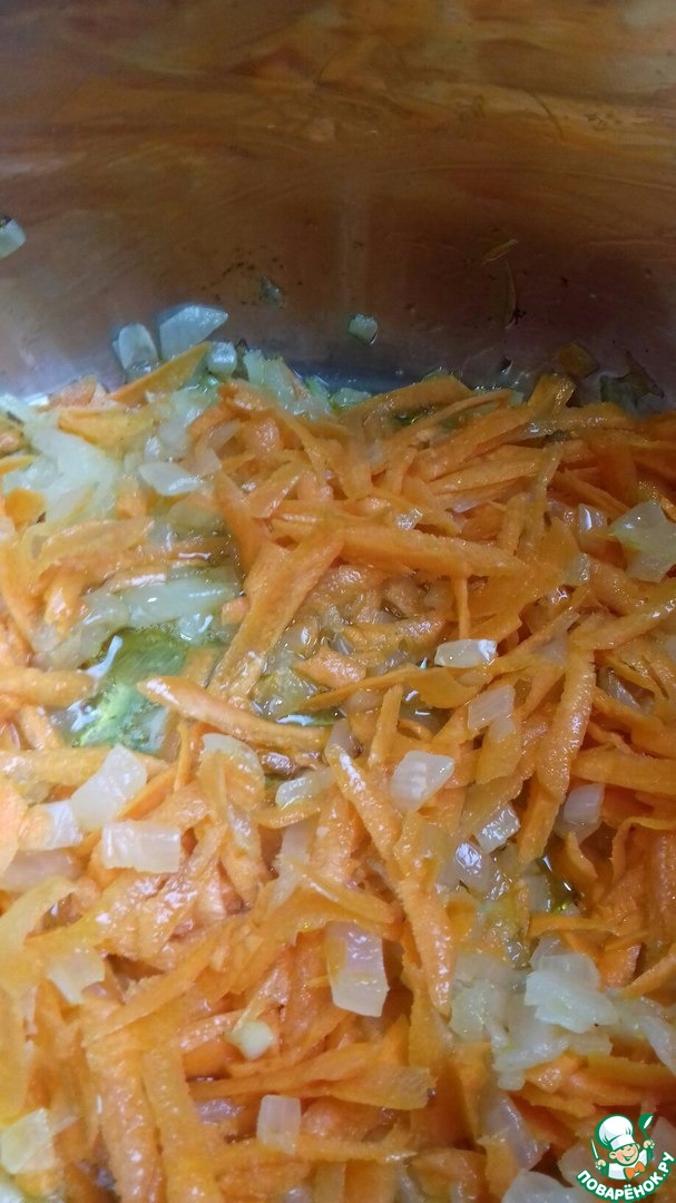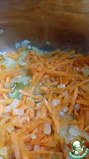 Лук нарезать, морковь натереть на мелкой терке, чеснок измельчить. Спассеровать все на растительном масле.