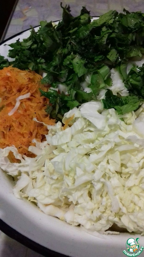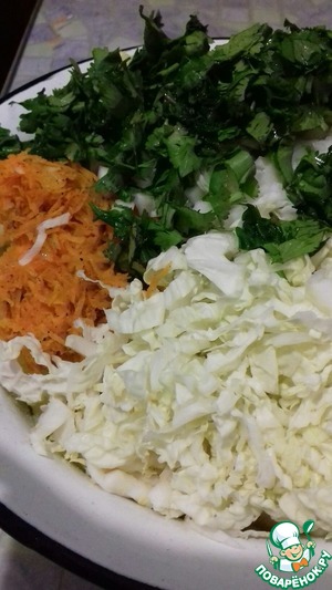 Пекинскую капусту тонко нашинковать. Зелень измельчить. Все добавить к картошке и перемешать.