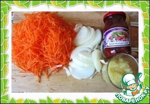 Морковь натираем на терке, лук нарезаем тонкими полукольцами, из яблока варим пюре: очищаем от кожуры, нарезаем тонкими ломтиками, перекладываем в кастрюльку, вливаем полстакана воды и тушим до полного разваривания минут 10-15. -