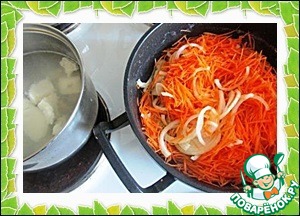 Вливаем в сотейник растительное масло, выкладываем лук и морковь и обжариваем до мягкости минут 7.