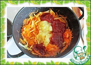 Добавляем яблочное пюре и томатный соус, хорошо перемешиваем и тушим ещё минуты 3.