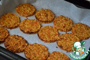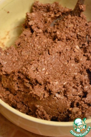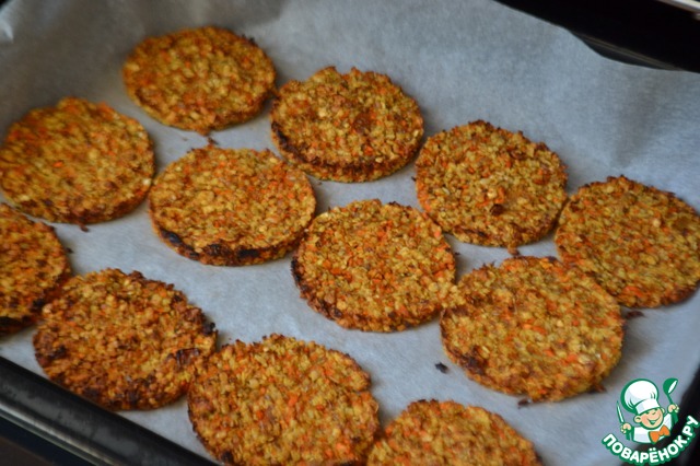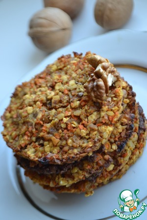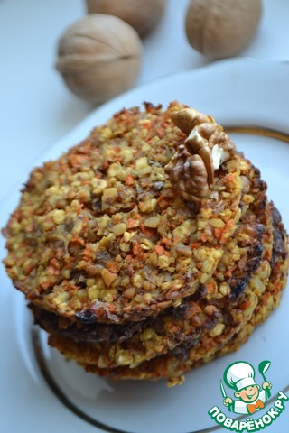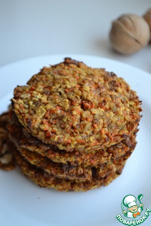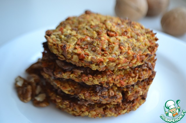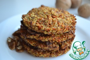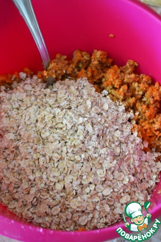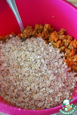 В блендере измельчить грецкие орехи, изюм и нарезанную морковь. Всыпать хлопья и вымесить тесто.