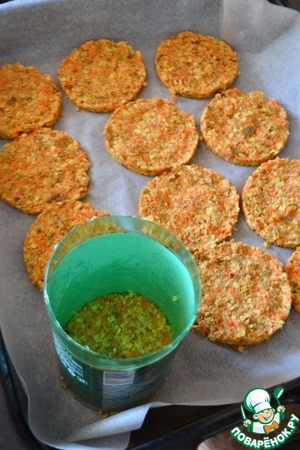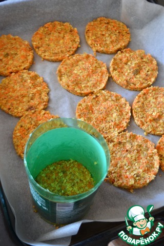 На противень на пекарскую бумагу с помощью кольца для салатов или, как я, с помощью самодельной формы из пластиковой бутылки, выложить коржи теста толщиной 0,5 см.