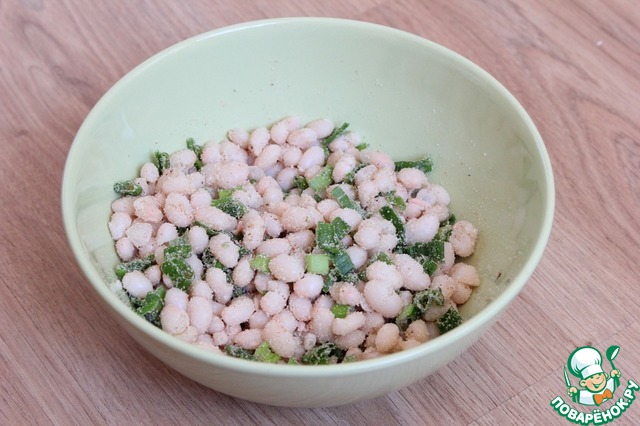 Смешиваю в миске фасоль, половину зеленого лука и 1 ст. л. панировочных сухарей. Добавляю соль по вкусу. -