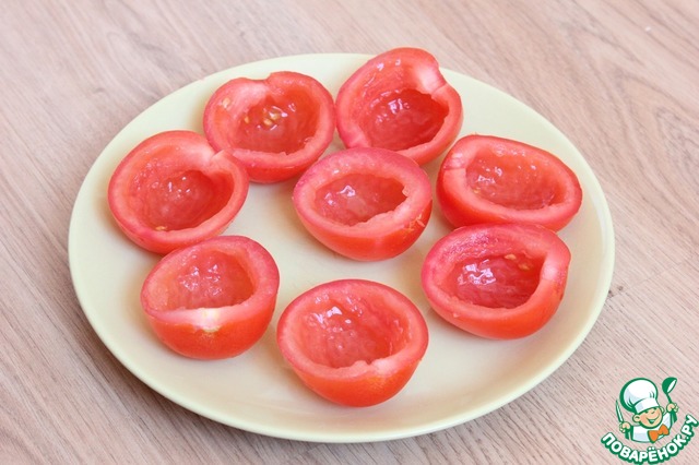 Помидоры режу на половинки, чайной ложкой удаляю всю середину из них. Должны получиться "чашечки".