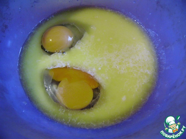 • Добавляем яйца, молоко, соду гашеную уксусом, сахар, соль.