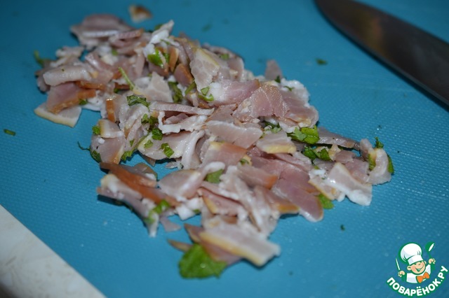 Чеснок я уже закинула на сковороду. Бекон нарезала и перемещала с мятой.