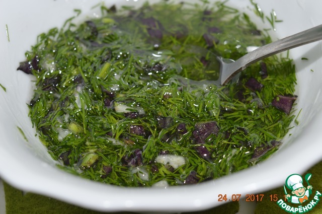 Воду смешиваем с растительным маслом, добавляем зелень и чеснок Оставляем, чтоб заливка настоялась.