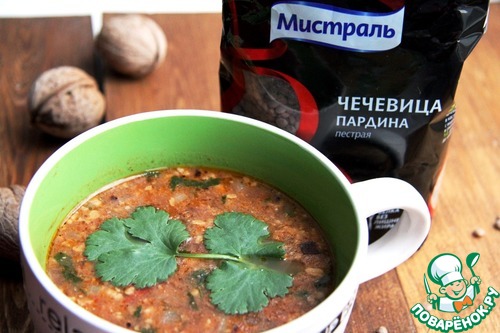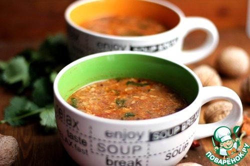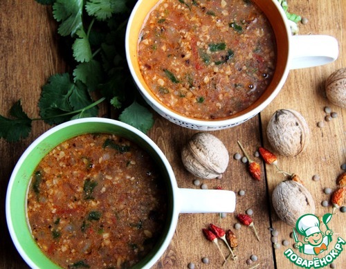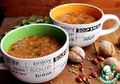 Просмотрев доступную информацию по этому супу, который готовят в Армении, поняла, что здесь, почти как с борщом: сколько хозяек, какой регион - суп будет свой!!! Но, неизменно его готовят с чечевицей и орехами. Варианты с сухофруктами могут быть любые: курага, сливы, изюм... Обычно, готовят его из говядины, но возможен и постный вариант, который я вам и предлагаю. Суп очень вкусный, густой, острый (ну, а как же? Кавказская кухня, все-таки!). Я очень рада, что открыла его для своей семьи.