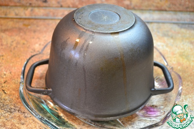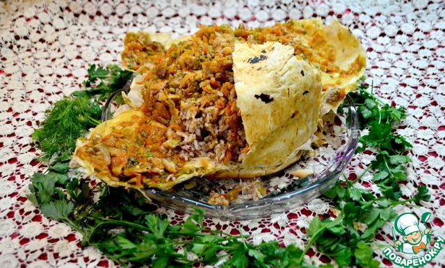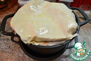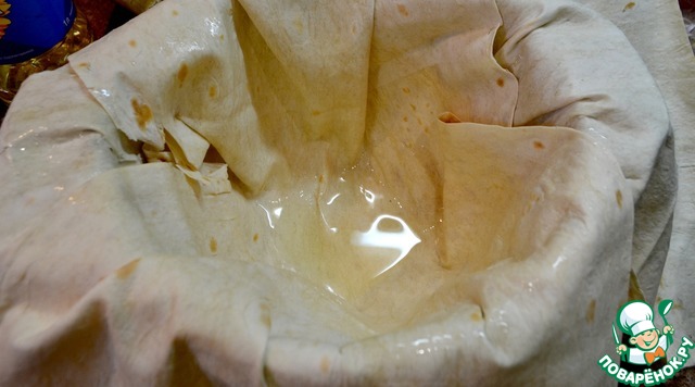 В казан укладываем наши лаваши, смазываем слои маслом, оставляем края, чтоб накрыть затем плов сверху