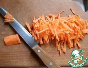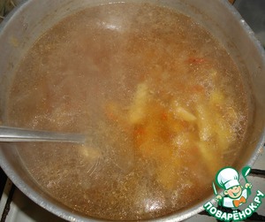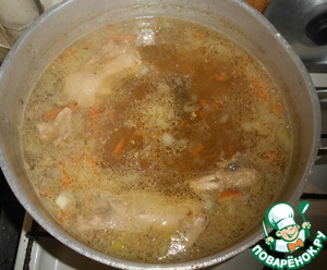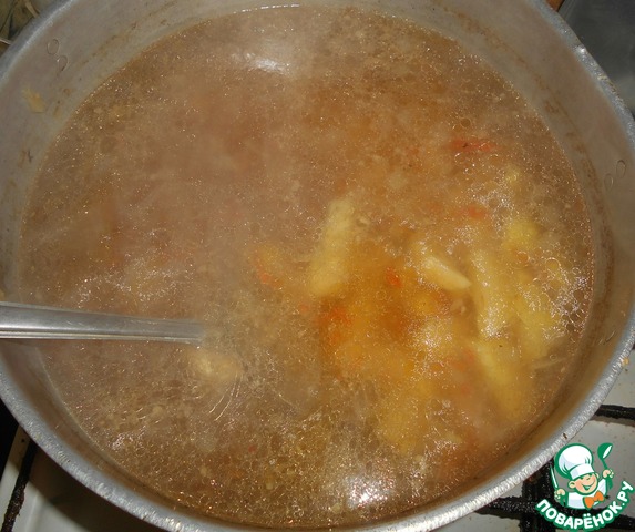 А морковь соломкой, если нет времени резать, то можно на терку. Половину лука и моркови бросаем в бульон после закипания и после того как убрали пену. И пусть варится на медленном огне около 1-1,5часа можно 2. Главное следить, если вода выкипает, то доливайте, но не больше чем на 2 пальца выше середины ( это примерно, я на глаз все делаю)