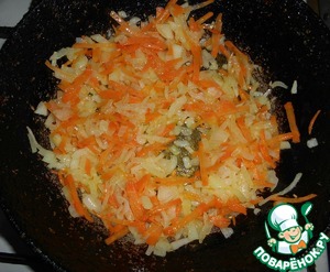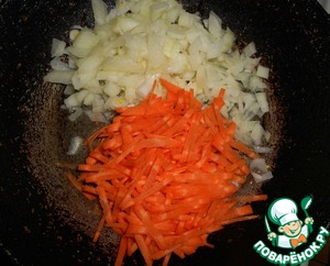 Так.. Бульон почти готов, можно приступить к зажарке. Выкладываем лук и морковь в разогретую сковороду с растительным маслом.