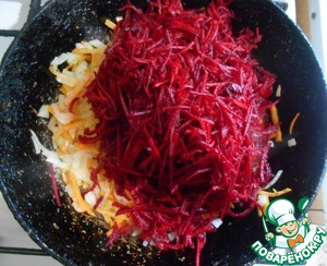 Пока жарится лук и морковь, натираем свеклу на корейской терке, если такой нет, то на обычной крупной или нарезать соломкой не очень толсто. Выкладываем в сковороду, обжариваем 6-7 минут на среднем огне, периодически помешивая.