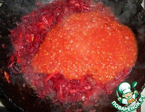 Измельчённый чеснок добавляем к свекле, перемешиваем и добавляем томат. Сейчас можно добавить паприку, но у меня её не оказалось и это не страшно, хуже без неё не будет.