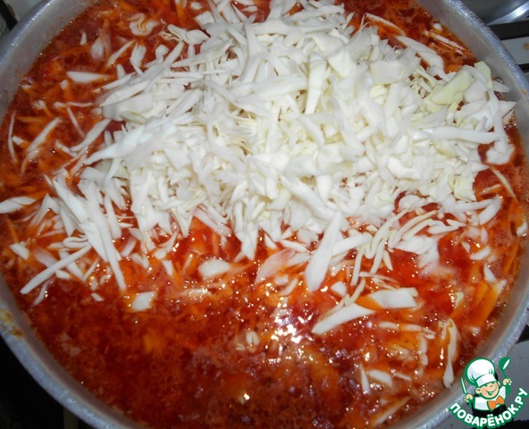Потом выкладываем в кастрюлю мясо, затем капусту.