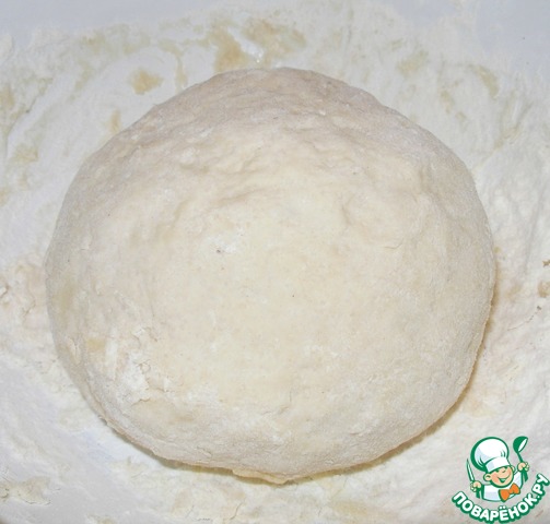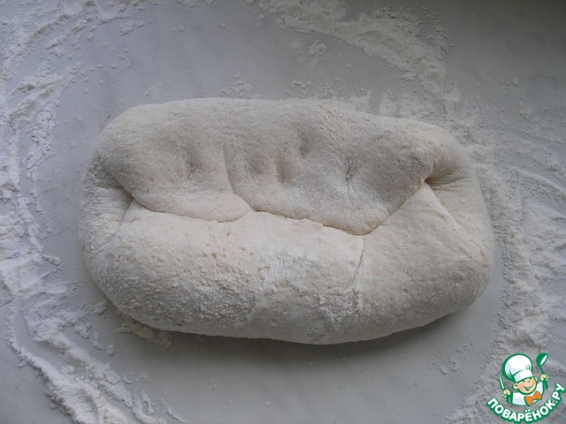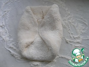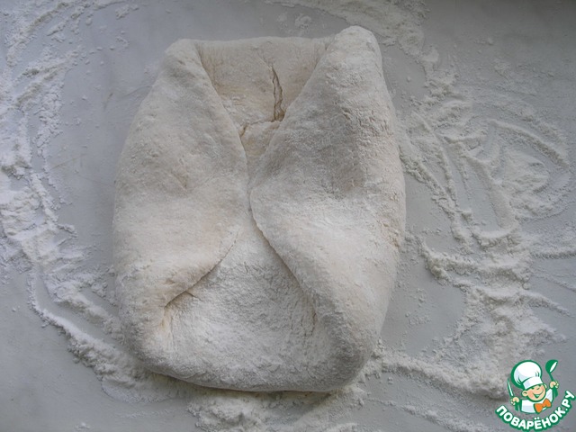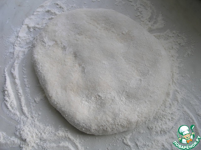 На данном этапе я включаю духовку на 200 градусов для разогрева. А также необходимо подготовить толстостенную форму с крышкой, хорошенько присыпав мукой. Из теста я раскатываю небольшой круг.