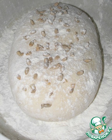 Перекладываю тесто в подготовленную форму швом вниз. Декорирую семечками, слегка их вдавливая в тесто, чтобы не осыпались, и немного присыпаю сверху мукой. Накрываю толстостенной крышкой и оставляю на 30 минут в тепле подходить.
