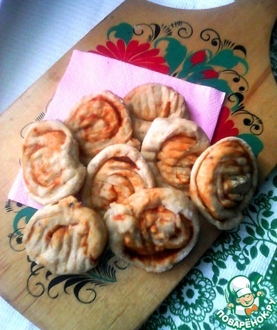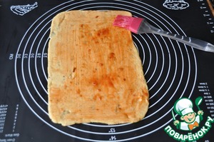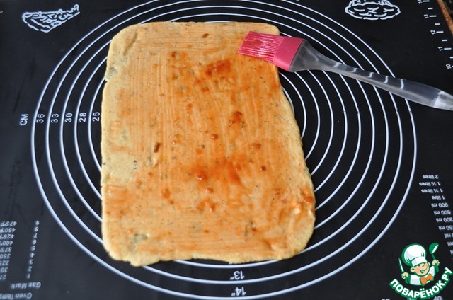 Раскатываем тесто в пласт толщиной 5 мм, смазываем кисточкой кетчупом.