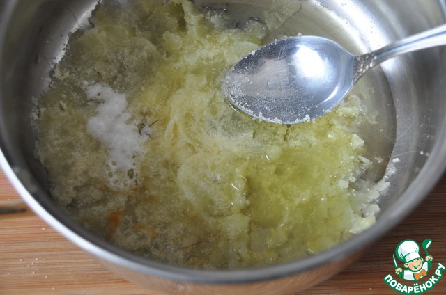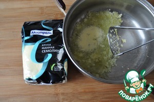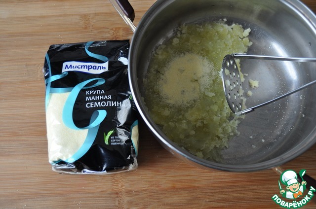 С готового картофеля сливаем воду, разминаем толкушкой и в горячий засыпаем манную крупу. У меня Семолина от "Мистраль". Перемешиваем.