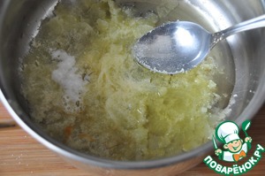 Наливаем рассол (у меня с помидоров), растительное масло, кладём соль, разрыхлитель, перемешиваем.