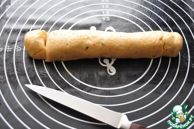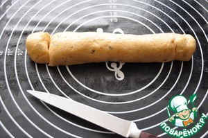 Сворачиваем пласт теста в рулет, режем на кусочки шириной 2 см.