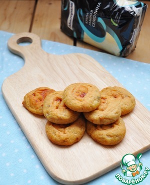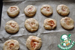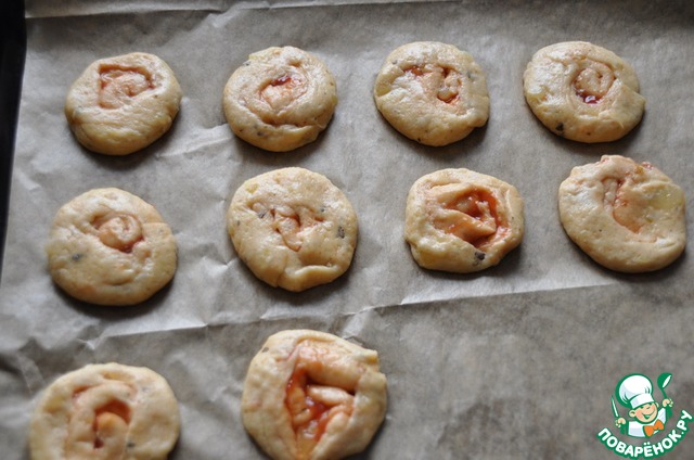 Застилаем противень пекарской бумагой, кладём на него рулетики, слегка их придавливаем. Ставим в нагретую до 200 градусов духовку, выпекаем до готовности 20 минут.