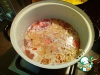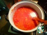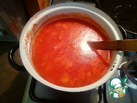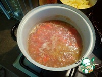 Когда чечевица сварилась, наливаем томатную пасту и бросаем к супу картошку. |