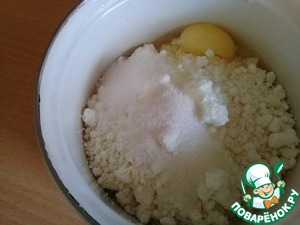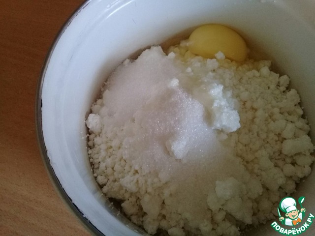 Выкладываем в кастрюльку или глубокую миску творог. Добавляем к творогу сахар, щепотку соли и яйцо и хорошенько все перемешиваем при помощи блендера. Всыпаем муку и снова перемешиваем до однородной консистенции.