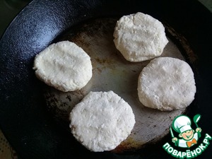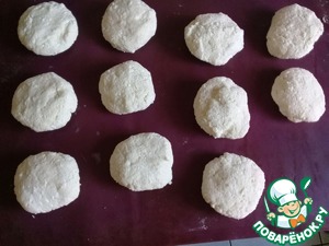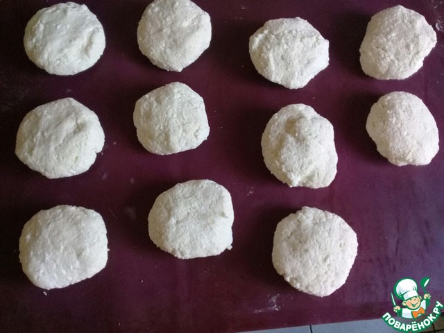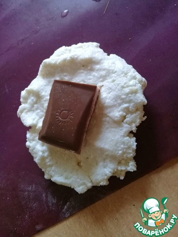 Из полученной однородной массы сформируем небольшие лепешки (у меня получилось 12 шт). На серединку каждой лепешки положите по квадратику шоколада.