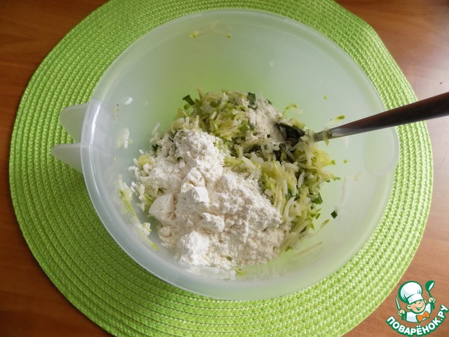 Выкладываем рис в посуду. Натираем кабачок, режем мелко лук зелёный. Солим и перчим. -